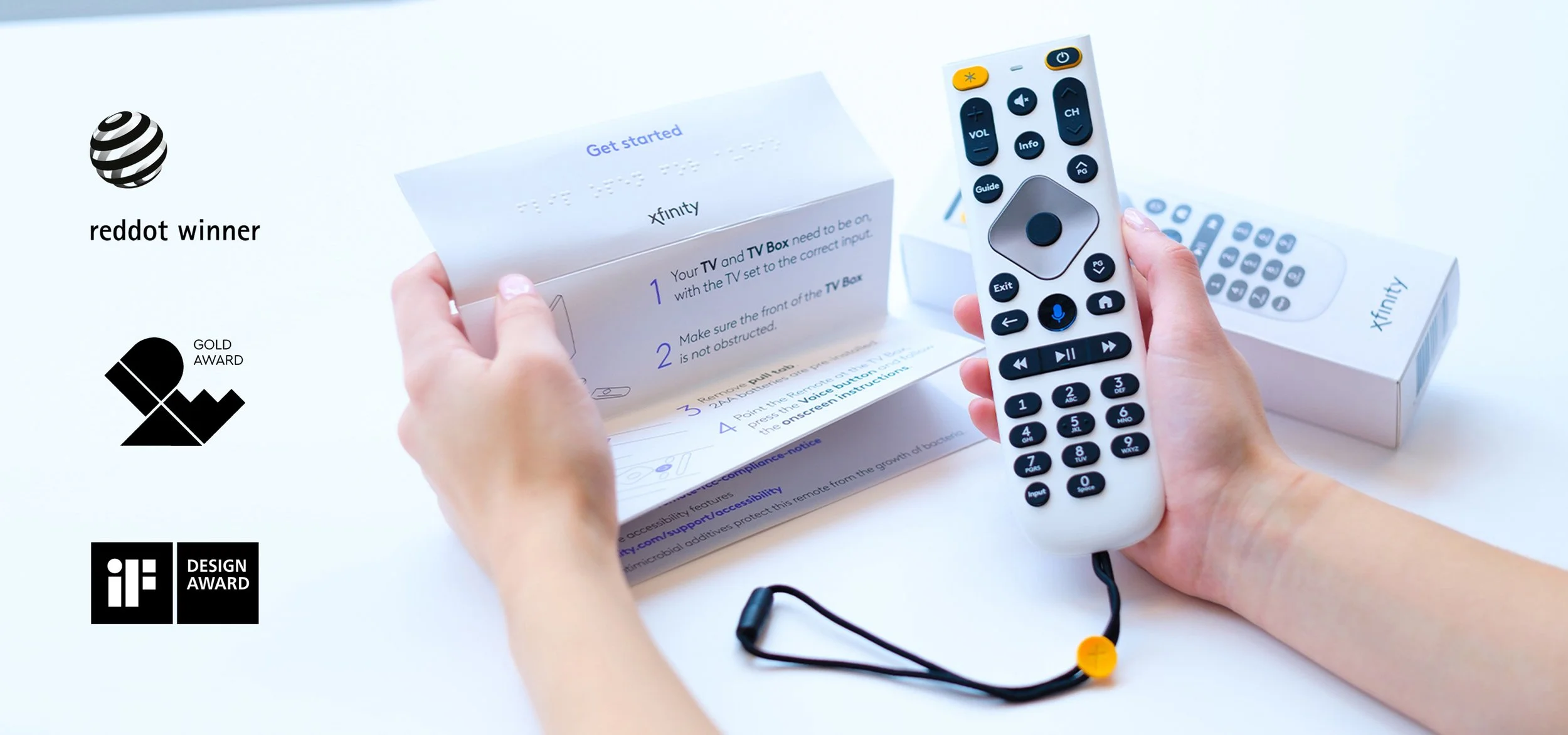 The Xfinity Large Button Voice Remote was recognized with a Red Dot, iF Design Award, and Gold IDEA in Consumer Technology, 2023.